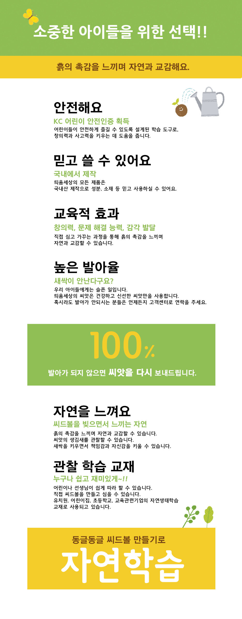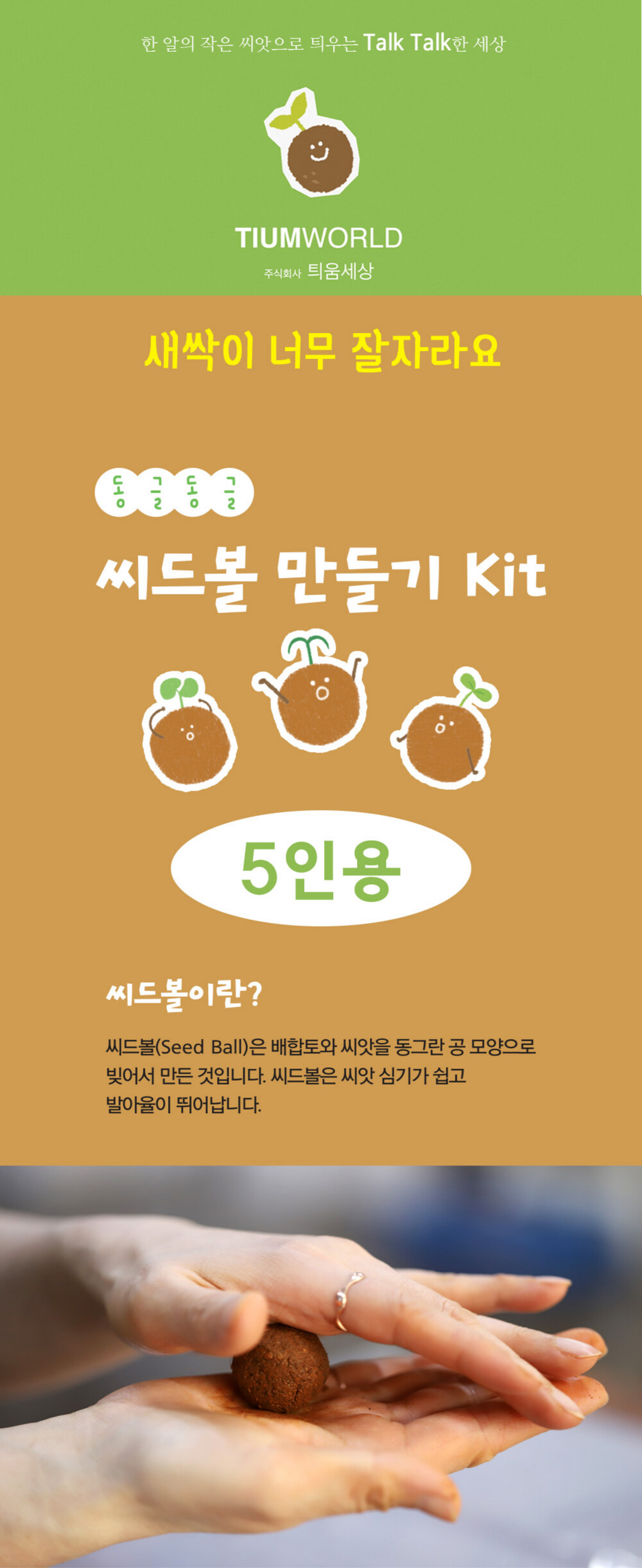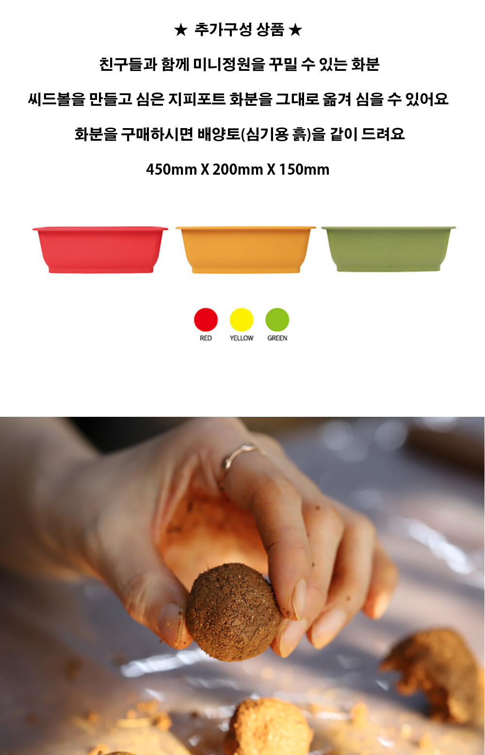 배합토와 씨앗을 동그란 공모양으로 빚어서 만드는 씨드볼을 심어 새싹을 키우는 제품